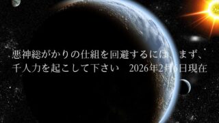 人類滅亡シナリオ回避の為、御神示をお読みください 悪神総がかりの仕組を回避するには、まず、千人力を起こして下さい 2026年2月6日現在 御神示では、絶望的文面では、まずは、神の国千切りとなるので、千人力になる事が目標です。今は、この事を打開できる方は、一厘もなく、足許からビックリ箱があいて、四ツん這ひになっても助からぬことになります。富士は晴れたり日本晴れ、として下さい。 2026.02.06 人類滅亡シナリオ回避の為、御神示をお読みください
